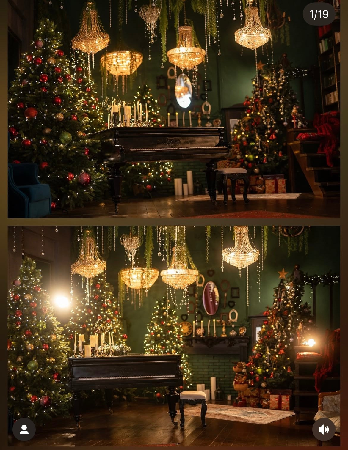 Погружение в эстетику фильма и музыки — роскошные интерьеры, свечи, фортепиано и ёлки.