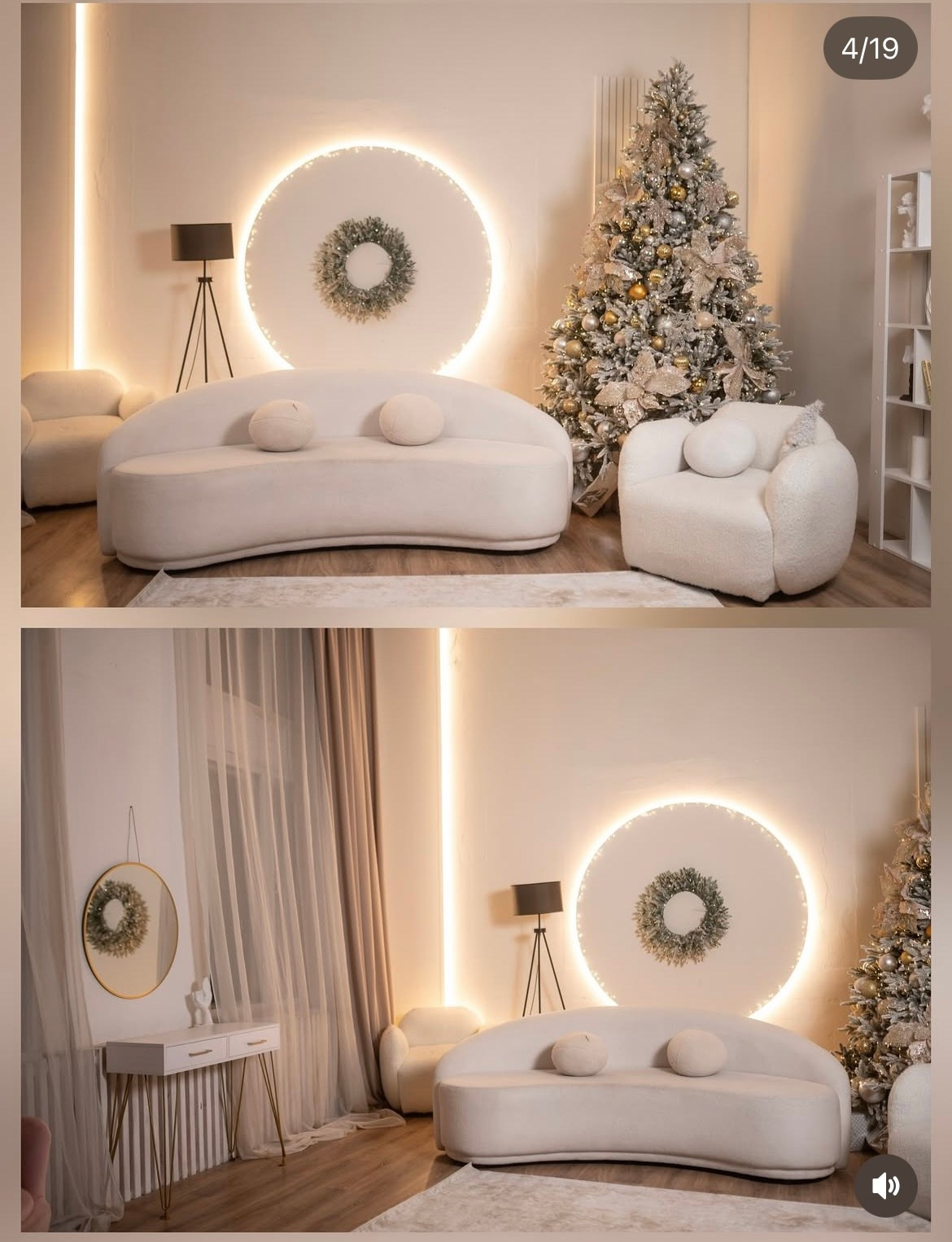 Залы: Изысканная гостиная с фортепиано и люстрами, уютная библиотека и светлый минималистичный интерьер с ёлкой.